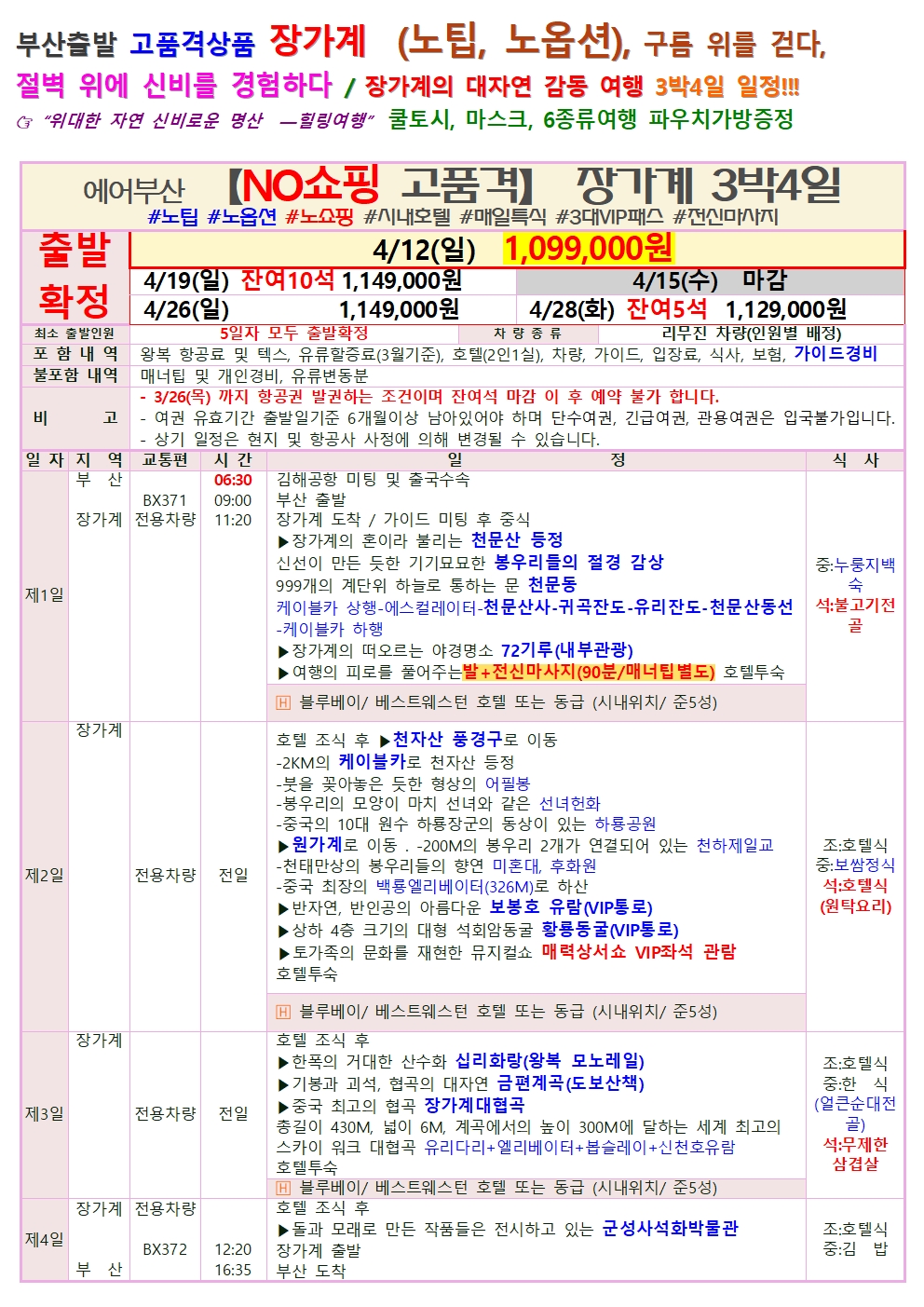 [부산출발] 장가계 대자연의 감동 위대한 절경 모아모아! 4일.5일
